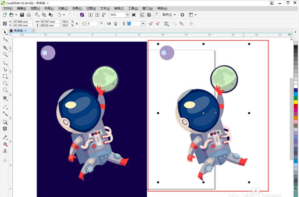 3、把拖拽進來的圖片放到軟件的左邊,鼠標左鍵選中圖片,往右移動鼠標,松開左鍵的同時點擊鼠標右鍵,就會在右側直接復制出來一張圖片。方便我們之后轉換矢量圖時觀察。