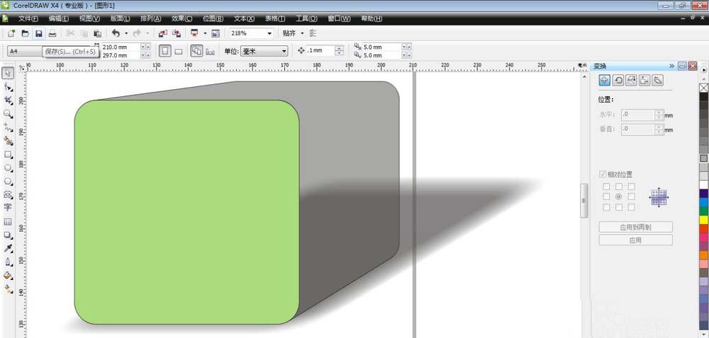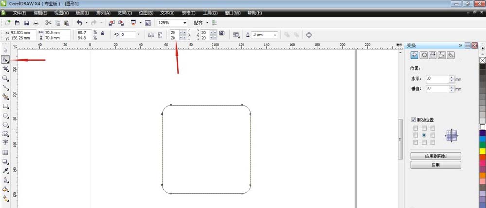 1、然后在用CDR中的形狀工具,給這個正四方形倒一個20的圓角。