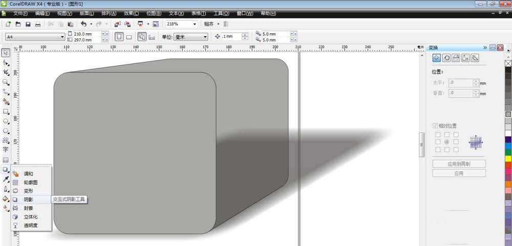 2、選中倒角正四方形,點擊交互式立體化工具,把倒角四方形變成倒角四方體,填為灰色,并添加陰影。