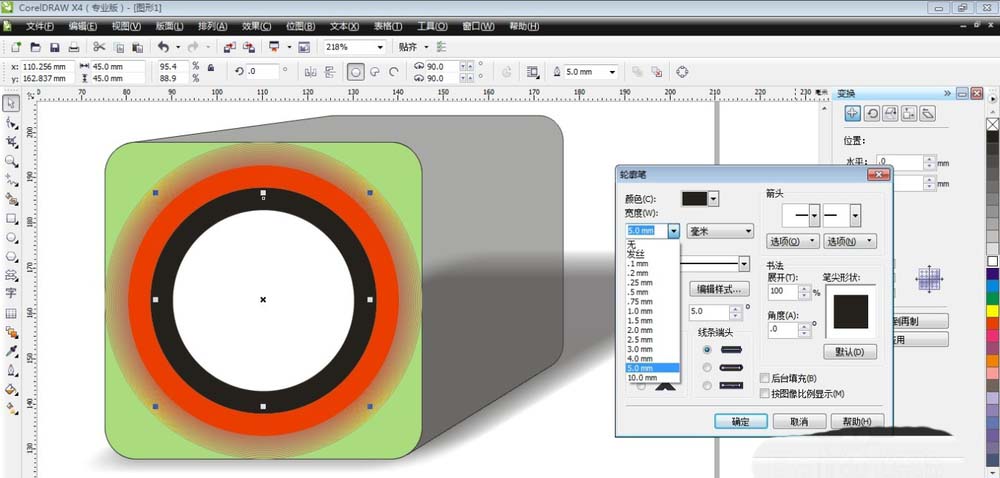 6、在紅色正圓的內部,畫一個直徑為4.5厘米的正圓,把圓的邊線加粗5個毫米,之后把圓的顏色填充白色。