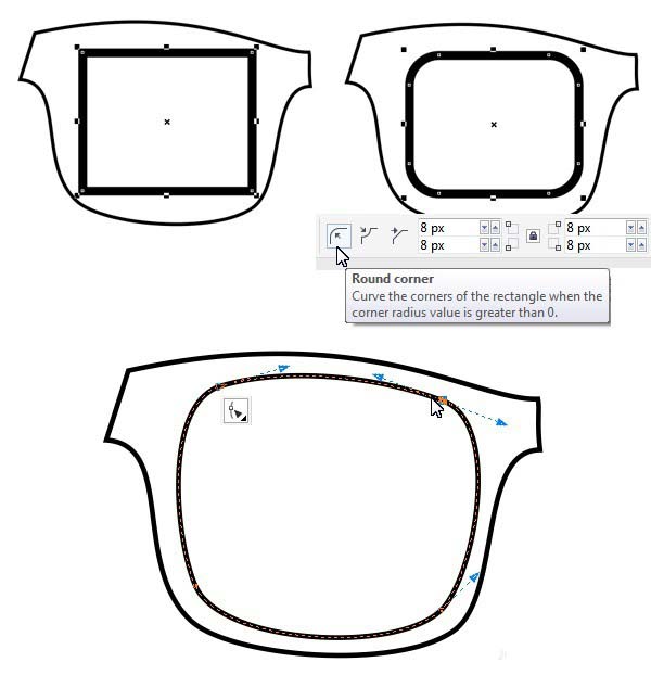 4、現(xiàn)在我們有了邊緣的基礎(chǔ),讓我們來形成鏡頭本身。先開始使用矩形工具(F6)并在玻璃框內(nèi)放置方形。使角稍微圓化,然后將矩形轉(zhuǎn)換為 曲線(Control-Q)。最后,再次使用形狀工具(F10)修改形狀,將其安裝到邊緣