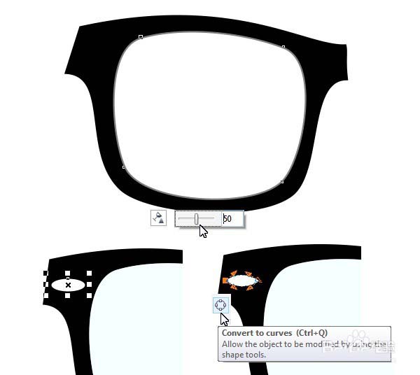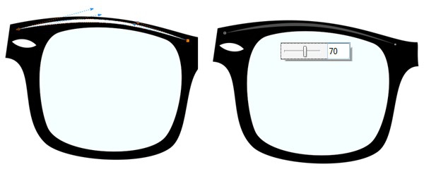 6、用淺藍(lán)色填充鏡片形狀,并使用具有統(tǒng)一透明度填充的透明度工具,將鏡片的不透明度降低50%。通過使用橢圓工具(F7)和將其轉(zhuǎn)換為曲線(Control-Q)形成一個橢圓,在邊緣的左側(cè)部分添加一個微小的裝飾元素。通過使用形狀工具(F10)移動控制手柄來銳化其角部。