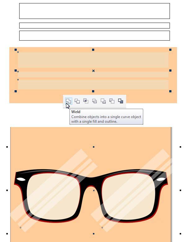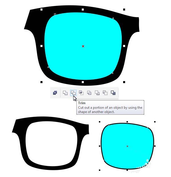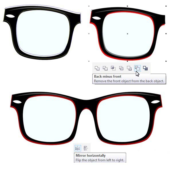 8、復(fù)制并粘貼 輪廓形狀兩次(Control+C> Control+V> Control+V),并將上部副本上下拖動一下。選擇兩個副本,并使用Back minus front功能切斷不需要的部分。將新創(chuàng)建的輪廓填充為深紅色,使輪圈更加生動和立體。組(Control+G)的眼鏡的所有創(chuàng)建部件,使副本,并通過創(chuàng)建眼鏡的第二半鏡像它 水平。