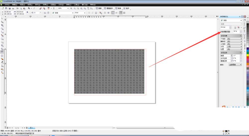 3、在文本框中輸入文字,在右邊的字符格式化中可以修改文字的字間距,如下圖所示,