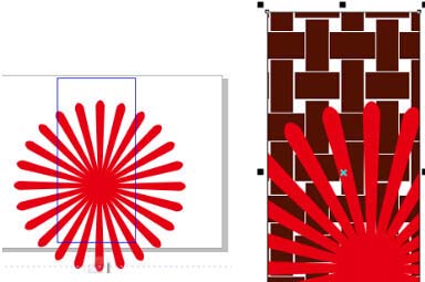 8、精確裁剪。將旋轉(zhuǎn)后的所有圖形進(jìn)行群組,執(zhí)行“對象”→“圖框精確剪裁”→“置于文本框內(nèi)”命令,當(dāng)光標(biāo)變?yōu)楹谏拇蠹^時,單擊矩形,得到的效果如圖所示。