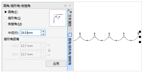 6. 框選所有弧形曲線,執行“窗口>泊塢窗>圓角/扇形角/倒菱角”命令,在右側顯示“圓角/扇形角/倒菱角”泊塢窗。選擇“圓角”按鈕,設置其半徑大小,作圖窗口會根據您設置半徑的變化實時預覽,待圓角半徑合適時,單擊“應用”按鈕,圓角即可應用直角圖形,效果如圖所示。