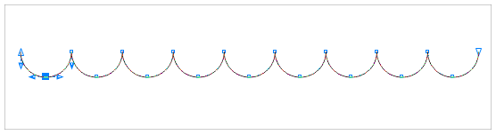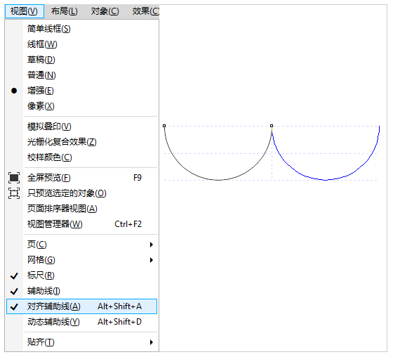 2. 利用鼠標左右鍵開始復制,選中弧形,按下鼠標左鍵將對象向右拖動到與第一個弧形末端貼齊狀態(開啟‘對齊輔助線’),在釋放鼠標左鍵之前按下鼠標右鍵,即將對象在當前位置復制一個副本對象。