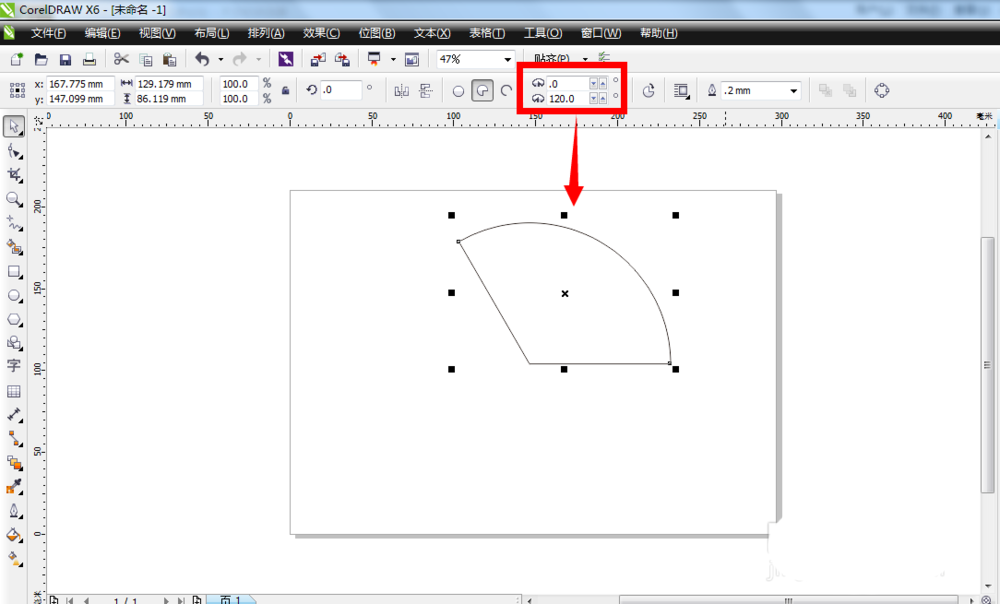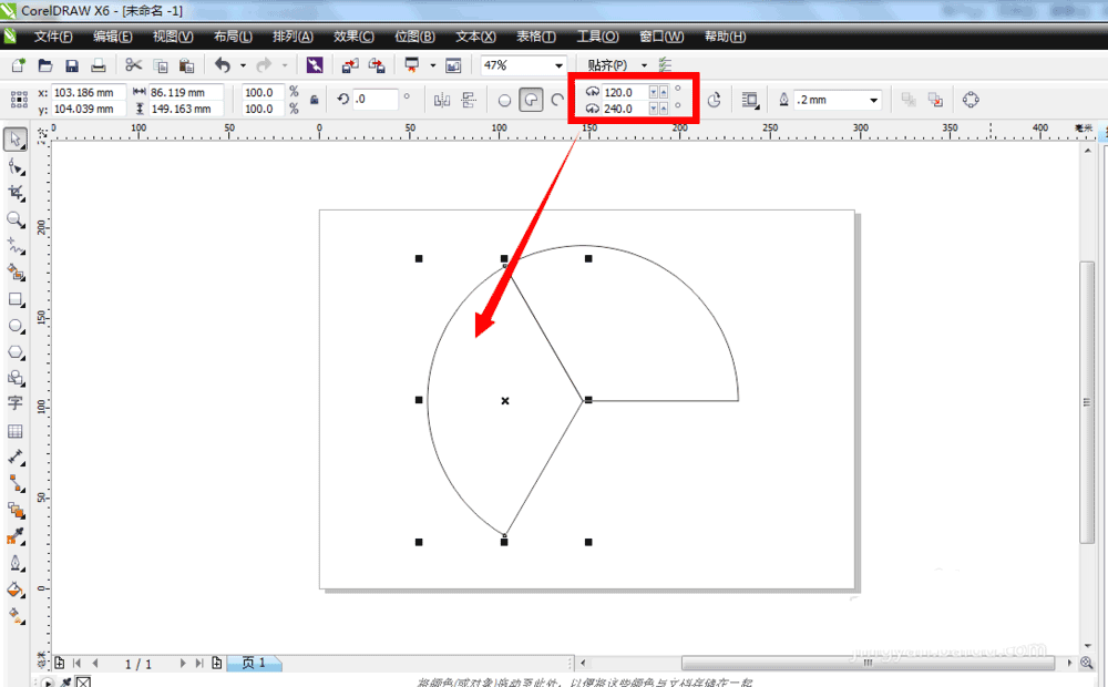 4、一個(gè)圓為360°,那么三等分的,也就是一個(gè)圓的三分之一,有120°。設(shè)置起始角度0°,結(jié)束角度120°,再按下鍵盤上的enter鍵,即可以得到三分之一的圓