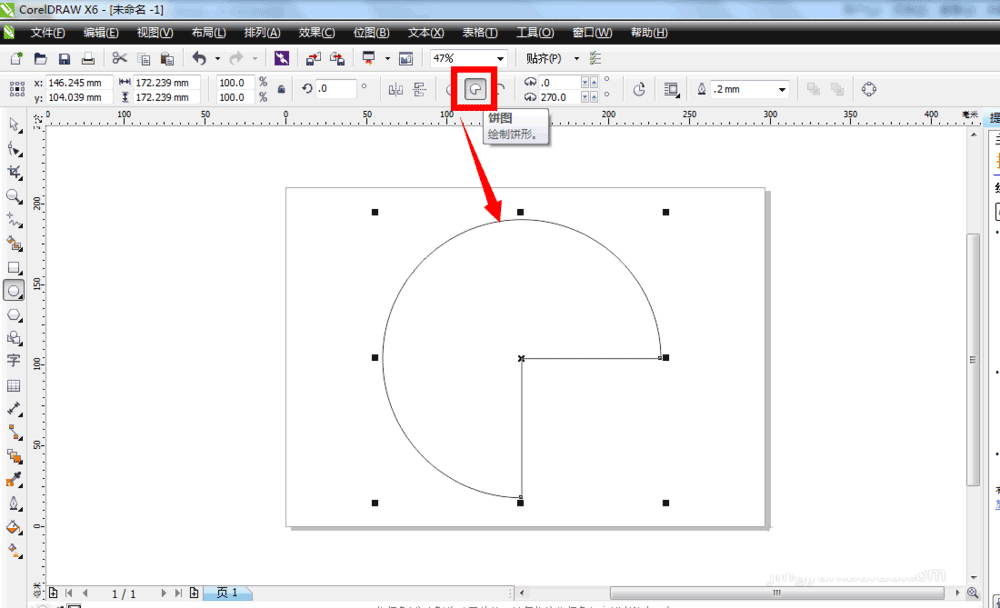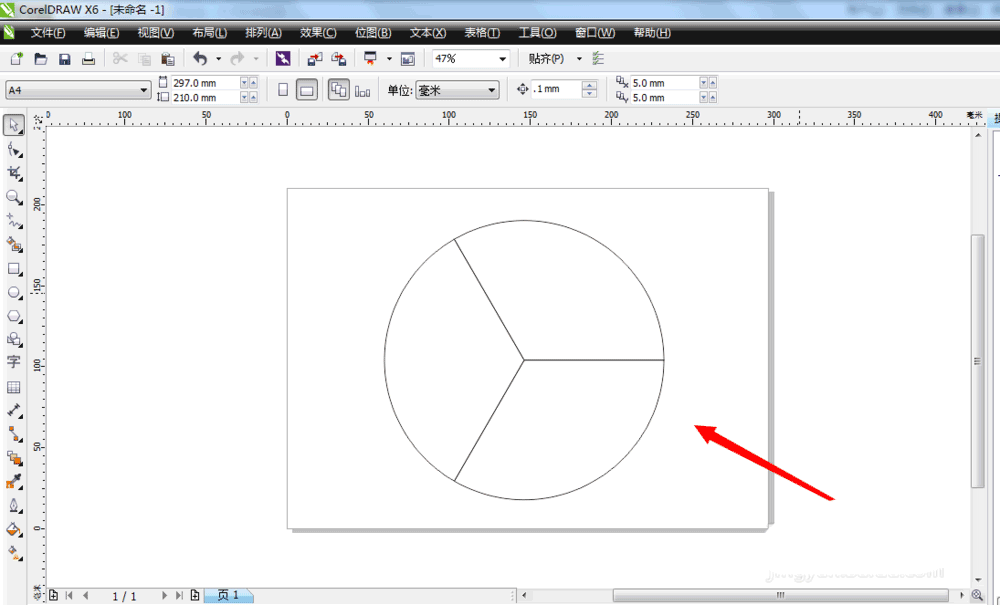 7、再把鼠標(biāo)在頁面的空白位置單擊一下,就可以得到一個(gè)完整的三等分的圓了。其他的幾等分,只要計(jì)算好每部分的角度數(shù)值,按照這個(gè)辦法,設(shè)置相應(yīng)的起始角度和結(jié)束角度即可。