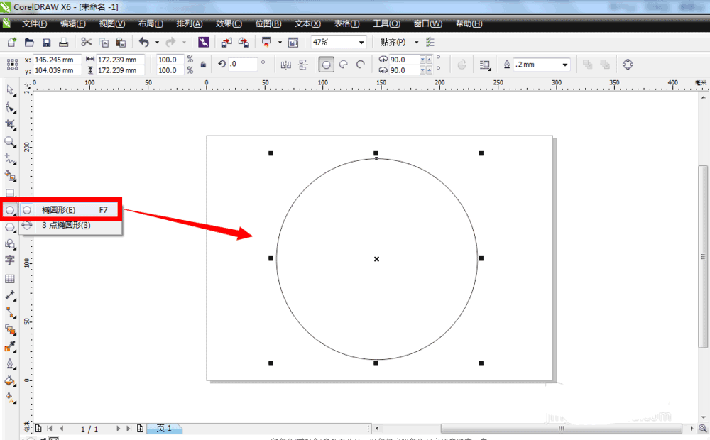 1、在cdr軟件左側(cè)的工具欄里面選擇橢圓形工具,按住鍵盤上的ctrl鍵,在頁面上繪制一個(gè)大圓