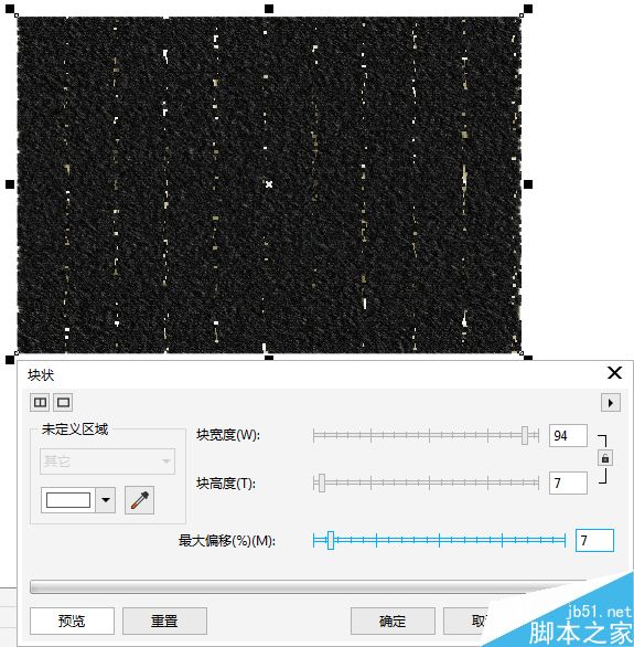 5. 繼續使用濾鏡效果,執行“位圖>扭曲>塊狀”命令,設置各項參數如下圖所示,單擊確定按鈕,使圖像分裂成塊狀的效果。