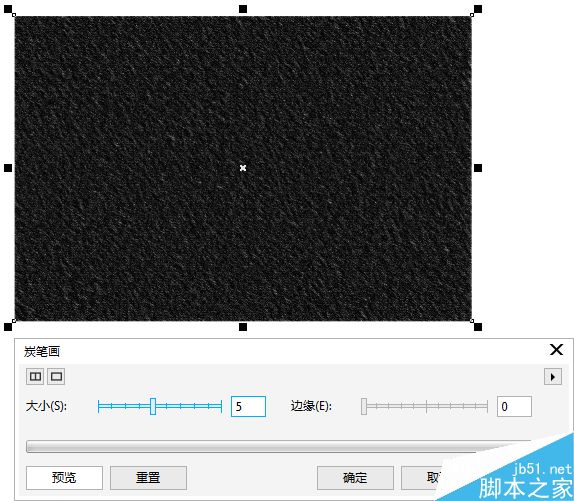 4. 在照片上繪制黑色矩形并轉換為位圖,執行“位圖>藝術筆>炭筆畫”命令,設置各項參數,單擊確定按鈕,使位圖圖像產生類似于用炭筆繪畫的效果。