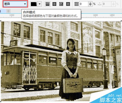 6. 使用透明度工具,設置其屬性欄中的“合并模式”,單擊右側黑色三角號,選擇“差異”模式,該模式可以從底色中減去透明度顏色。最終實現褪色懷舊照片的制作。