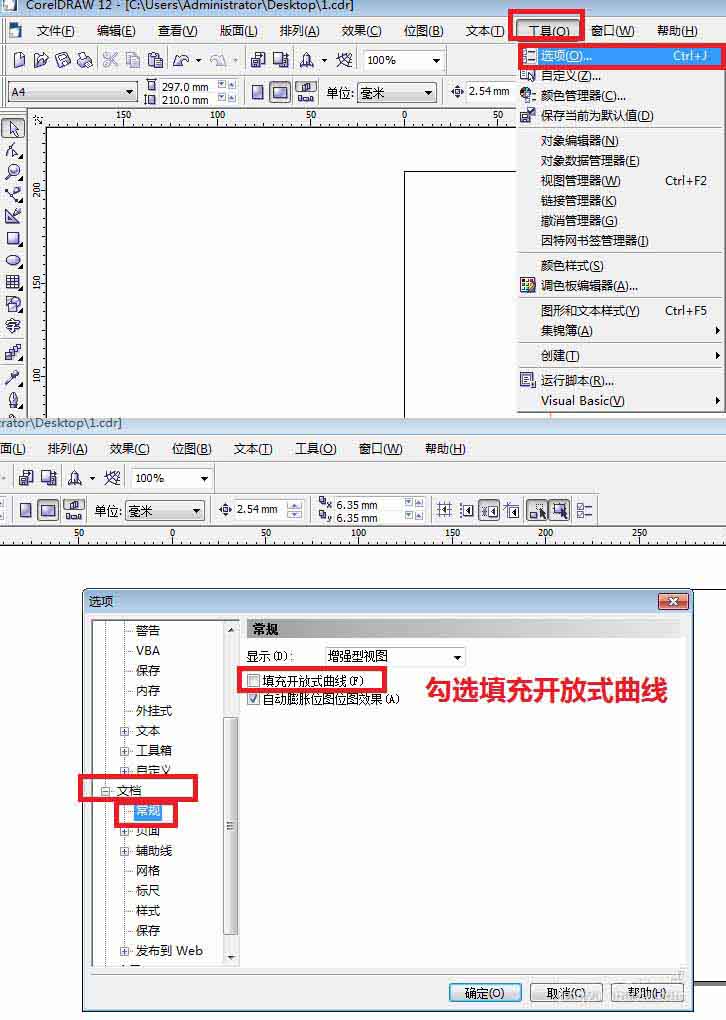 6、選擇菜單工具/選項/文檔/常規/勾選填充開放式曲線,填充顏色即可。