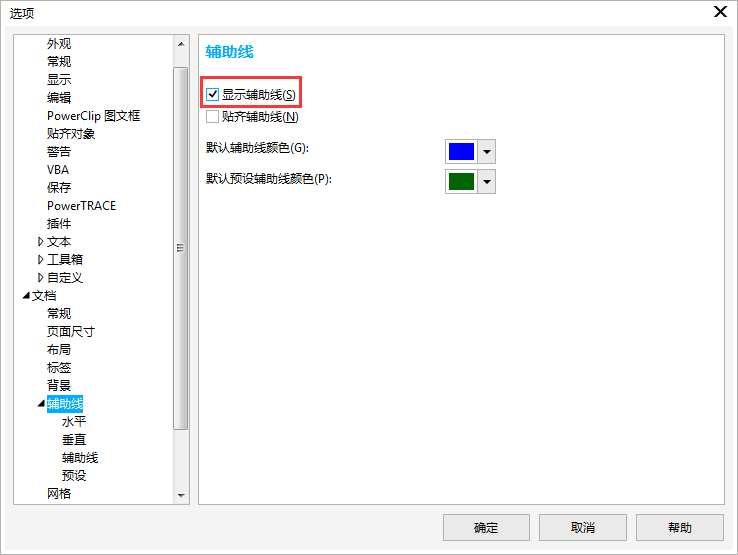 方法三:還可以通過單擊“工具>選項”,然后單擊文檔類別列表中的輔助線,在面板右側,選擇“顯示輔助線”復選標記表示顯示輔助線。