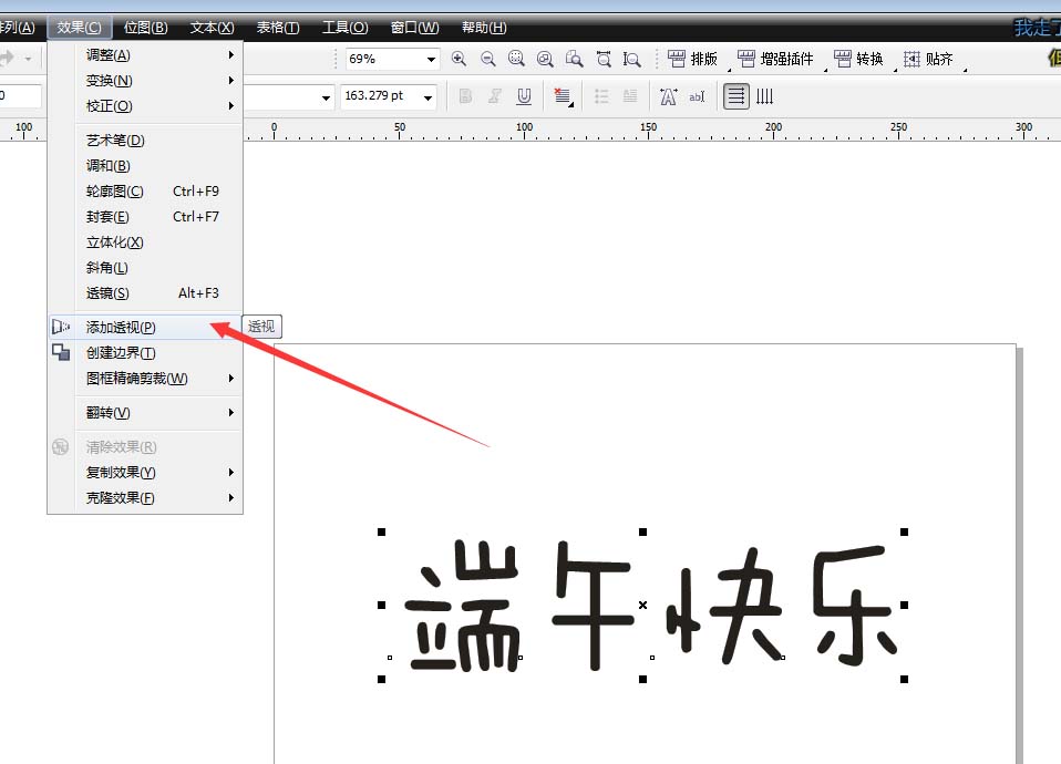 2、選中文字,點擊上面的菜單欄效果,添加透視,會發現字上面有一層網格狀點陣圖形。