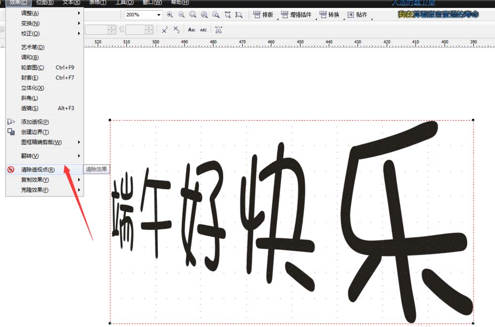 5、如果不要透視效果了,可以取消了重新做,選擇要清除效果的內容,點擊菜單欄效果,點擊下面清除透視點選項,文字就還原成最初效果了。
