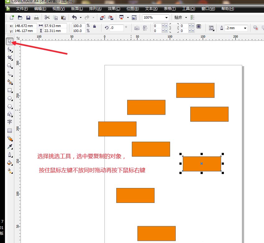 選擇挑選工具,選中要復制的對象,按住鼠標左鍵不放同時拖動再按下鼠標右鍵,可把選中的對象復制到工作區內任意地方