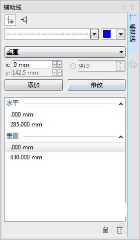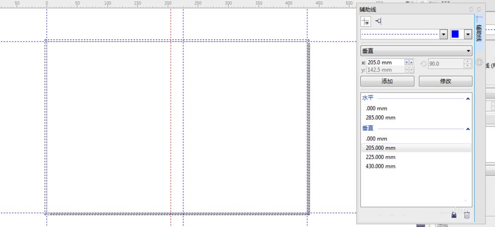 4、在展開圖中心留出書脊(書脊(book back,Backbone),是指書刊封面、封底連接的部分,相當于書芯厚度)位置,書脊的制作主要裝訂方式為:無線膠裝的 除了它還有:騎馬釘,鎖線膠裝等。點擊標尺右鍵選擇輔助線設置 參數如圖。垂直225,205.