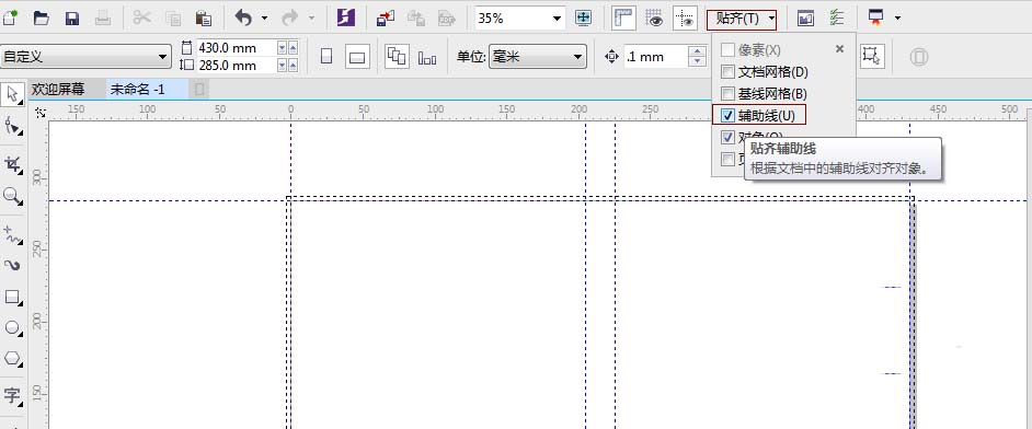 5、接下來,在屬性欄,點擊貼齊,勾選一下“貼齊輔助線”