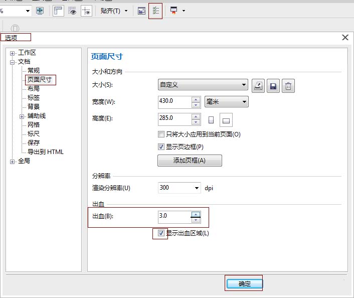 3、由于這是整體的產品尺寸展開圖,我們需要印刷成品,在畫冊裝訂的時候需要預留裁切,所以就要留出血位。我們先點擊屬性欄圖標(或按ctrl+J)-->選項-->文檔-->頁面尺寸-->出血:3mm-->顯示出血位(前面打勾)-->點確定