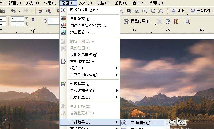 2、接著,鼠標左鍵單擊菜單【位圖】>>【三維效果】>>【三維旋轉】,如下圖所示。給素材圖片添加一個三維旋轉效果。