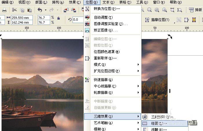 4、然后,鼠標左鍵單擊菜單【位圖】>>【三維效果】>>【柱面】,如下圖所示。給素材圖片添加一個柱面效果。