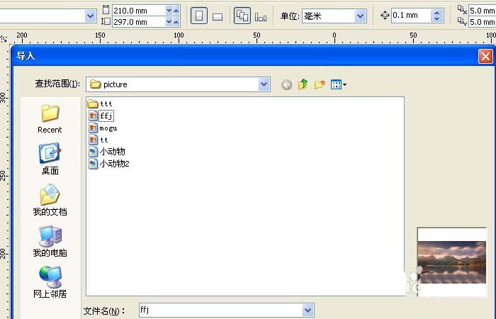 1、打開CorelDRAW軟件,新建一個空白的文件,鼠標左鍵單擊菜單【文件】>>【導入】,如下圖所示。找一張風景圖片作為素材。