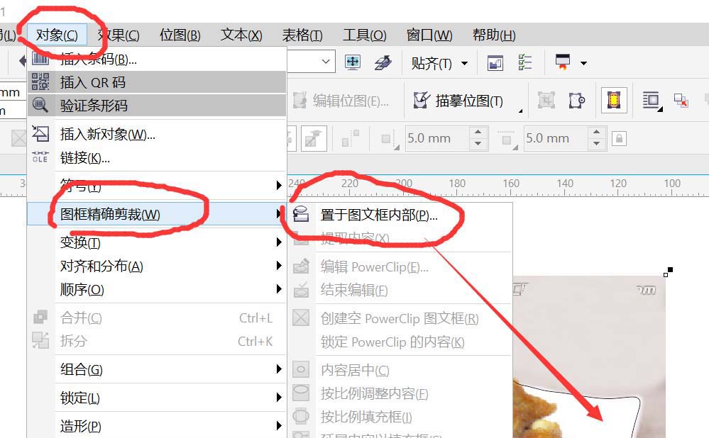 4、描好圖片之后,選擇圖片,然后點(diǎn)擊上方的對(duì)象>圖框精確裁剪>置于圖文框內(nèi)部,然后把圖置于你所描的圖形中