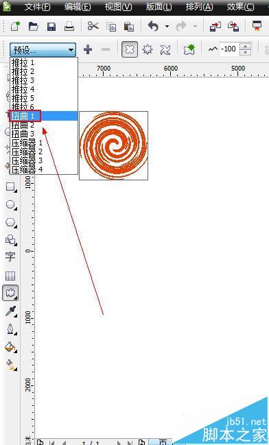 6、如圖所示,在彈出的下拉列表菜單中,我們點擊箭頭所指的這個扭曲1類型。