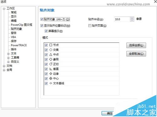 2、如繪圖時如果暫時用不到貼齊功能,可以先禁用部分或者全部貼齊模式,以加快CorelDRAW X7的運行速度,如果需要此功能時點擊開啟即可,操作也是很方便。
