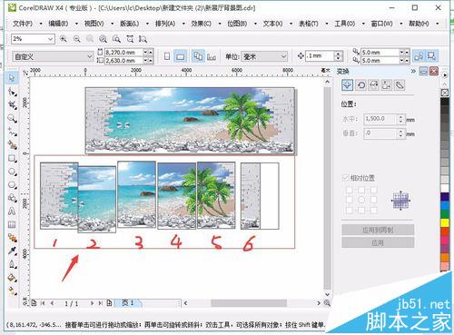 2、上圖為壁紙的設計素材,做為壁紙,在噴繪打印后我們需要重新拼接并貼到墻壁上,因此需要對圖片素材進行無縫的裁切,分塊導出。我們的思路是,使用1.5米寬的壁紙材料進行噴繪打印輸出,因此需將8270mmX2630mm圖片進行橫向裁切,即8270mm除1500mm,約裁剪為5.5張分塊小圖。如下圖,裁切分塊后的效果圖。