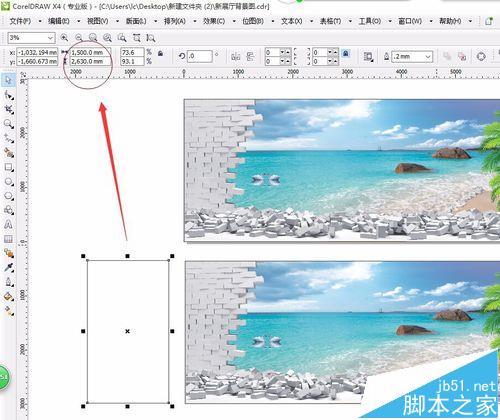 4、選擇左邊工具欄的“矩形”工具,在工作臺是拖出一個矩形,并將矩形的尺寸設置為1500mm寬(即壁紙材料的寬),高2630mm(大圖的高度一樣,因為壁紙噴繪材料為卷裝材料,通常一卷材料的長度為30米或50米,所以,長度我們往往無需考慮)。
