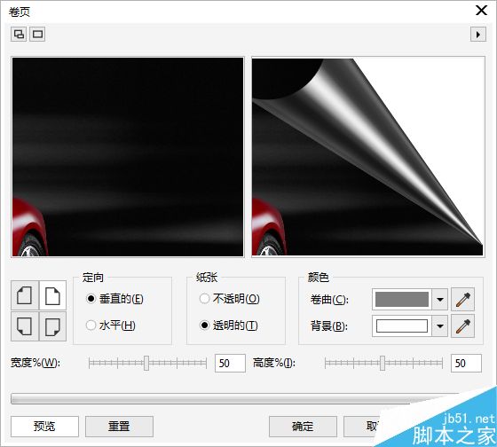 5. 調(diào)整卷頁各項參數(shù),并且可以點擊預(yù)覽來查看效果,單擊“確定”按鈕,位圖即可應(yīng)用濾鏡。效果如圖所示。