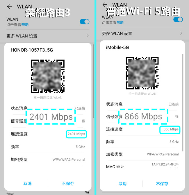 同時配合端到端凌霄芯片的加持,榮耀路由3還支持1024-QAM和160MHz大頻寬工作模式,理論連接速率最高可達2976Mbps(574Mbps@2.4GHz +2401Mbps@5GHz),5GHz頻段相比80MHz Wi-Fi 6網絡的1200Mbps,理論速率直接翻番,相比80MHz的5G Wi-Fi 5網絡(866Mbps),優勢就更明顯了。