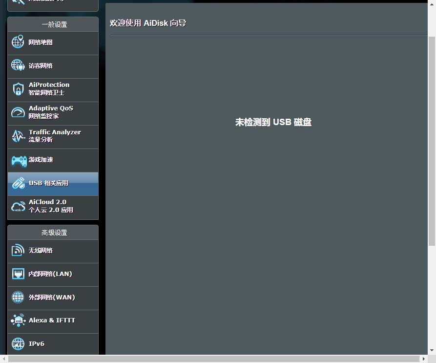 4、我們選擇左側的USB相關應用,如果沒有連接外接硬盤,這里也會看到信息,如下圖,未檢測到USB硬盤。