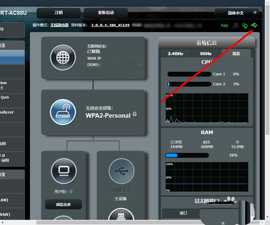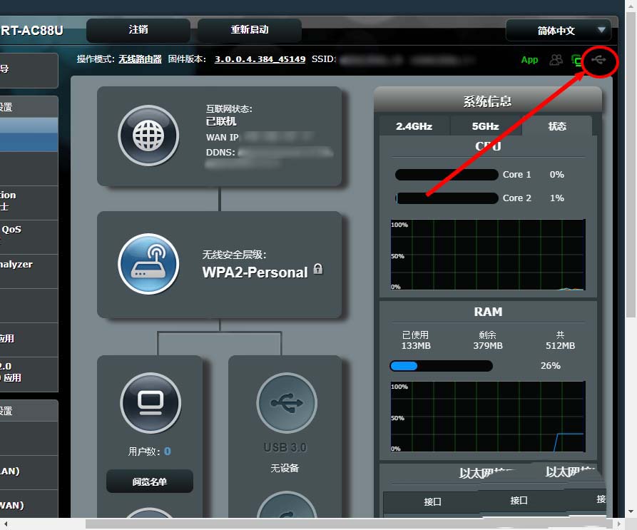 1、現在一般稍好點的路由器都可以外掛硬盤使用,一華碩AC88U說明如何看路由器外掛硬盤,進入路由器后臺管理畫面。
