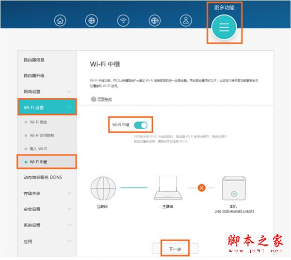 2. 單擊“更多功能 > Wi-Fi 設置 > Wi-Fi 中繼”。