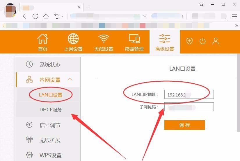 5、選擇LAN口設(shè)置,將LAN口IP設(shè)置成與一級(jí)路由器不同。