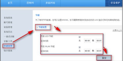 單擊:設(shè)備維護(hù)--》節(jié)能設(shè)置--》開啟LED節(jié)能和WLAN節(jié)能后的復(fù)選框。