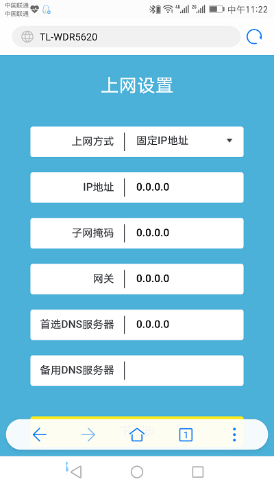 (3)、如果檢測到上網方式是:固定ip地址(靜態IP) ——> 則需要在頁面中,填寫運營商提供的 ip地址、子網掩碼、默認網關、首選DNS服務器、備用DNS服務器,如下圖所示。