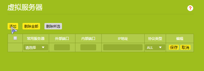5、點擊添加添加虛擬服務器,此時填寫信息,常用服務器可以不勾選,外部端口是外部用戶訪問所需的端口,而內部端口則是實際對接到主機的端口,兩者最好相同。
