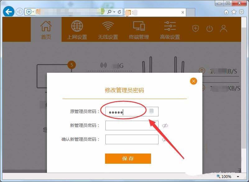 5、修改管理員密碼對話框中,原管理員密碼處,輸入登錄路由器的默認密碼。