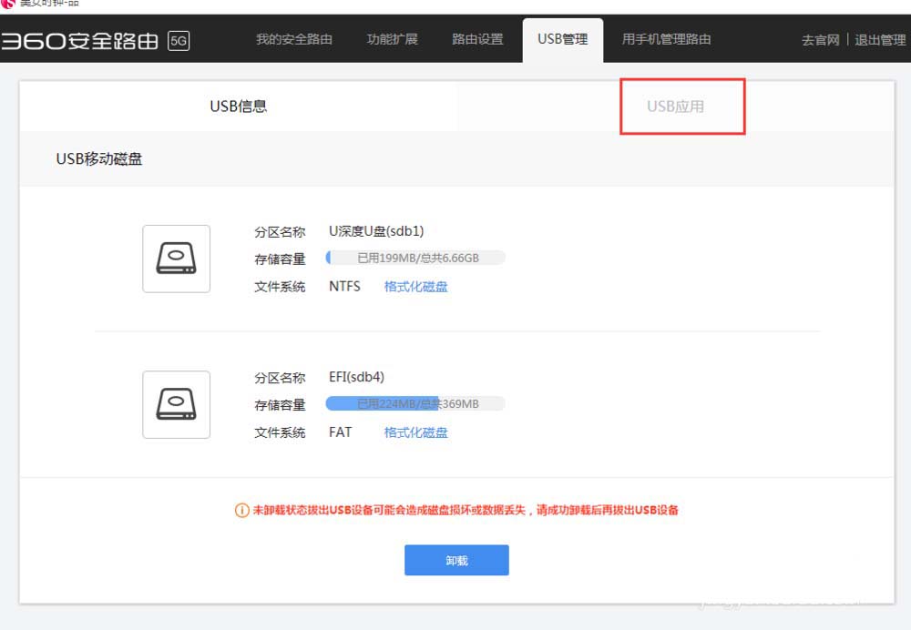 2、在主界面中,點擊菜單欄中的“USB管理”,進入到USB管理頁面