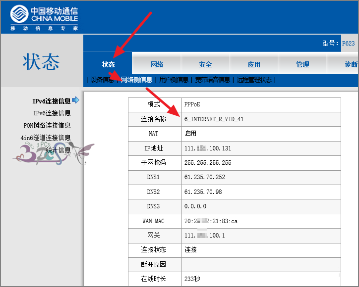 4、然后去狀態中查看是否已經撥號連接成功。獲取外網地址。