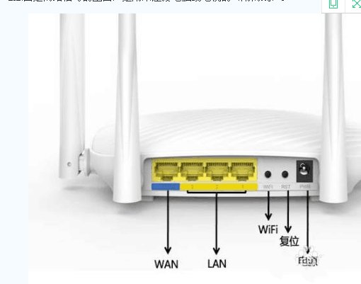 5、無線路由器就是那個發(fā)射WiFi的設(shè)備,我們平時能有WiFi都得靠它。下圖是路由器的接口示意圖,通常無線路由器有一個WAN口和3-4個LAN口,WAN口和LAN口都會用不同顏色區(qū)分開來。WAN口是連接到貓/光貓的(用網(wǎng)線),可以理解為網(wǎng)絡(luò)信號進入的接口。LAN口是網(wǎng)絡(luò)信號的出口,是用來連接電腦或電視的(用網(wǎng)線)。