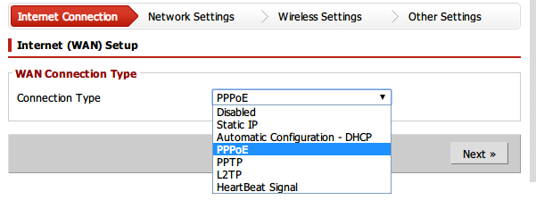 5、由于本例為配置為通過ADSL上網,所以點擊上圖藍色方框內的小三角,然后選擇PPPoE。