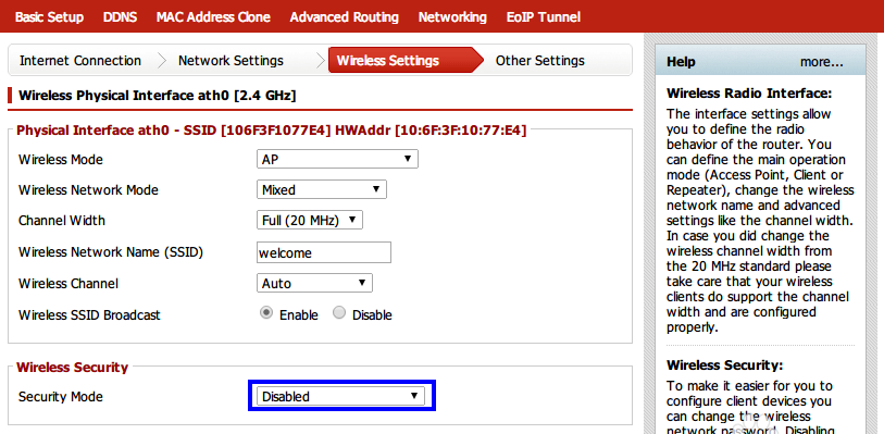 9、上圖中的藍色方框內默認為“Disabled”,即無須密碼即可連接,個人建議不修改此選項,反正其他人手機上網也用不了多少。如果要設置密碼,點擊“Disabled”旁邊的小三角,出現如下畫面。