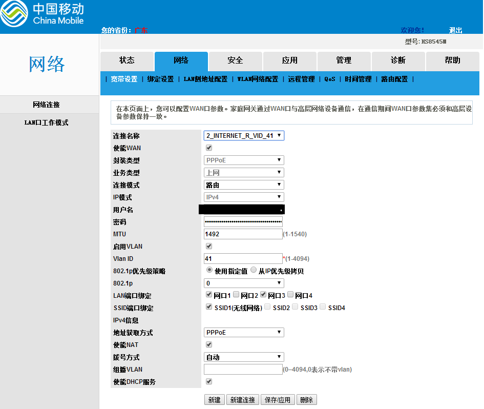 1、登錄web管理,超級(jí)用戶:telecomadmin、admintelecom、網(wǎng)絡(luò)-寬帶設(shè)置-新建,配制如下,用戶名、密碼是移動(dòng)給的,注意不要端口綁定。