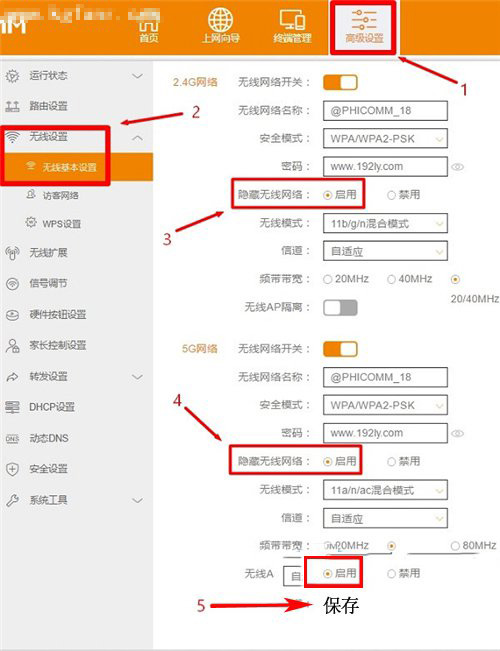 3、點擊“高級設置”——>“無線設置”——>“無線基本設置”——>然后在“隱藏無線網絡”選項下,選擇:啟用——>再點擊頁面下方的“保存”按鈕。